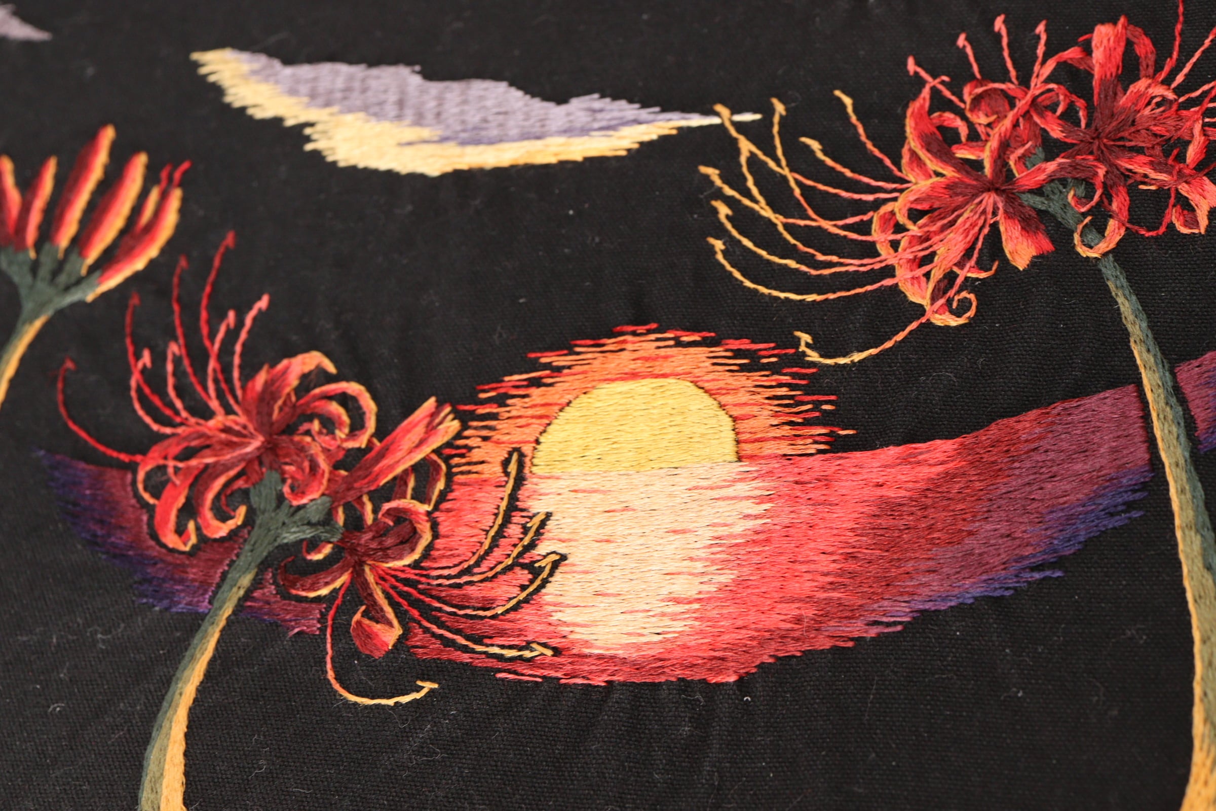 彼岸花の海に沈む太陽を、絹糸を使って手刺繍しました。