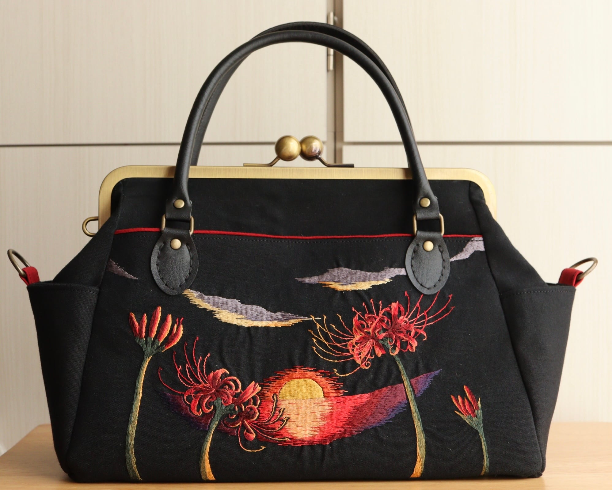 27センチがま口バッグ 彼岸花-再生 絹糸手刺繍